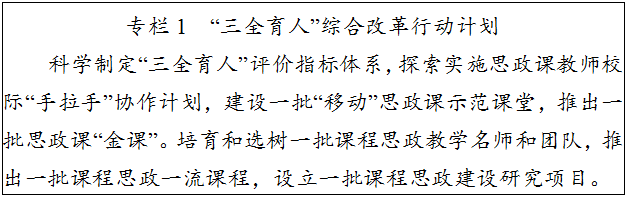 2.推進高校“三全育人”綜合改革。鞏固和拓展“三全育人”綜合改革試點區建設成果,貫徹“三全育人”湖南共識,加快構建目標明確、內容完善、標準健全、運行科學、保障有力、成效顯著的高校思想政治工作體系。深化高校思政課改革創新,聯結思政小課堂與社會大課堂、網絡大空間,推動課堂教學和實踐教學有機結合,充分運用豐富的紅色教育資源和厚重的歷史文化資源,緊密聯系中國共產黨和中國人民的奮斗歷程,辦好學校思想政治理論課。加強互聯網思想政治工作載體建設和新媒體平臺應用。培養一批思想政治工作名師、優秀團隊、中青年骨干和優秀輔導員。