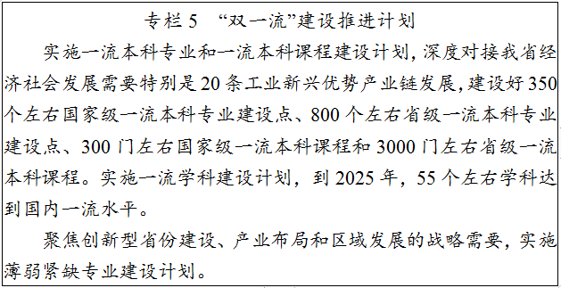 2.加快發展高水平本科教育。推動高等教育差異化、特色化發展。加快一流本科專業和一流本科課程建設,全面實施“六卓越一拔尖”計劃2.0,加快新工科、新醫科、新農科、新文科建設,建設一批線上、線下、線上線下混合、虛擬仿真、社會實踐“金課”,努力實現課程思政建設在所有高校、所有學科專業全面推進。推進課堂教學體系建設,推動精品在線開放課程和其他優質課程學生跨校選修,建立高校間學分互認與轉換合作機制。推動現代信息技術與課堂教學深度融合,探索線上線下相結合的教學新模式,積極推廣小班化教學、混合式教學、翻轉課堂和智慧課堂。深化創新創業教育改革,建立產業鏈、創新鏈、教育鏈有效銜接機制,聯合地方政府、行業企業開展產教融合協同育人,建設40個左右省級現代產業學院,推動建設一批國家級現代產業學院,建設創業基地、創客中心、創新工場等眾創空間,建設一批在全國有影響的創業學院,建立健全創新創業學分累積和轉換制度。