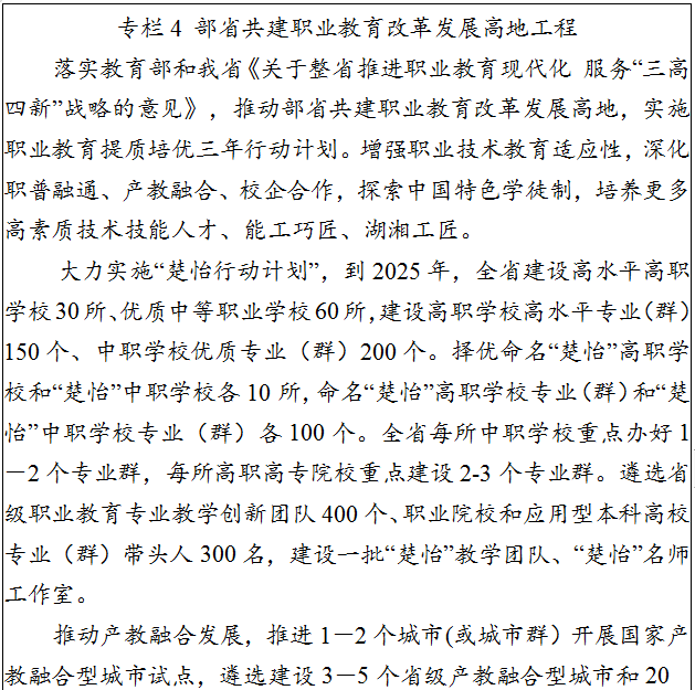 4.提升產教融合發展能力。深入貫徹落實國家和我省產教融合相關政策,進一步完善產教協同育人機制。推動岳麓山國家大學科技城、馬欄山視頻文創產業園產教研深度融合,打造全國一流大學城、科技城、創業城,培育一批產教融合型城市、縣市區和企業。建立產教融合型企業認證目錄,調動行業企業參與辦學積極性、主動性。深化職業教育集團化辦學,積極推進產教聯盟、專業聯盟建設,支持校企共建一批高水平專業群。全面推進現代學徒制改革。穩步推進“1+X”證書制度試點。探索推進職業教育股份制改革。建立政府、園區、企業和職業院校共建共享機制,統籌整合現有資源,促進校企合作,深化產教融合。完善科教融合、產教融合育人機制,科學規劃布局建設集成電路、人工智能、儲能技術等國家產教融合創新平臺。