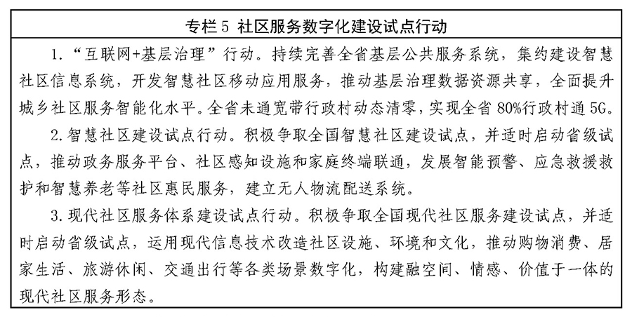 9.構筑美好數字服務新場景。統籌推進智慧社區基礎設施建設,推動社區服務和管理功能綜合集成,完善線上線下相結合的智慧社區服務體系。推進數字社區服務圈、智慧家庭建設,加快提升社區和家庭互聯網寬帶接入能力,促進社區家庭聯動智慧服務生活圈發展。培育推廣數字化應用場景,支持利用互聯網、物聯網、區塊鏈、大數據、云計算、人工智能等現代信息技術,開展議事協商、養老、家政、衛生、托育、消防、安防等社區治理服務。大力發展社區電子商務,探索推動無人物流配送進社區。以縣(市、區)為單位,深入組織開展智慧社區、現代社區服務體系試點建設。加快推進國家智能社會治理實驗社區治理領域特色基地建設。