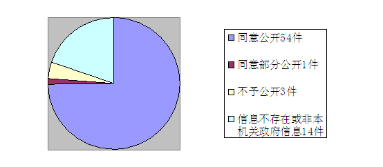(二)辦理情況。2015年,省食藥監局共受理公開政府信息申請74件,其中,本年度已答復72件,申請人撤銷申請2件。在72件答復件中,根據政府信息公開有關規定,“同意公開”的54件,占74.7%;“同意部分公開”的1件,占1.4%;“不予公開”的3件,占4.2%;“非政府信息、政府信息不存在、非本機關政府信息”的14件,占19.7%。從數據上分析,由于今年省局推行行政審批制度改革,下放了一大批食品藥品、醫療器械行政審批許可項目,導致非本機關政府信息申請數量占比較大。(如下圖)