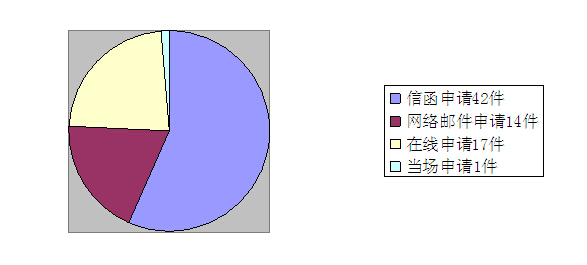 (一)受理情況。2015年,省食藥監局共收到政府信息公開申請74件,比2014年增加41件,同比增長124 %,其中,按申請人居所分,省內申請42件,省外申請32件,分別占依申請公開總量56.7%、43.3 %;按申請渠道分,信函申請42件,網絡郵件申請14件,省政府信息公開在線申請17件,當場申請1件。從受理情況看,2015年依申請公開總量比去年增長1.2倍,這充分說明食品藥品集中統一監管效能得以發揮,廣大群眾對食品藥品安全關注度越來越高。同時,數據顯示:2015年依申請公開省內多于省外;信函申請仍是依申請公開的主要渠道,網絡郵件成為依申請公開的快捷道;食品生產類信息依申請公開占大多數,且呈上升趨勢。