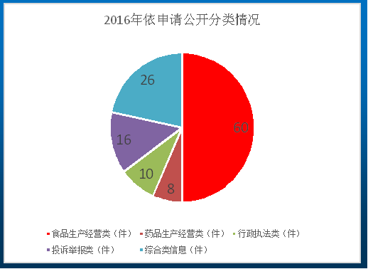(一)受理情況。2016年省食品藥品監督管理局共收到政府信息公開申請120件。從受理數量分析,2016年依申請公開總量比2015年增加46件,是2015年的1.62倍,這充分說明食品藥品集中統一監管效能得以發揮,廣大群眾對食品藥品安全關注度越來越高。按申請人居所分析,省內申請81件,省外申請39件,分別占依申請公開總量66.1%、33.9 %;按申請渠道分析,信函申請77件,網絡郵件申請40件,當面申請3件;從食藥監管業務類別分析,食品生產經營類60件,藥品生產經營類8件,行政執法類10件,投訴舉報類16件,其他綜合類信息26件,分別占依申請政府信息總量的50%、6.6%、8.3%、13.3%、21.8%。數據顯示:2016年依申請公開省內多于省外;信函申請仍是依申請公開的主要渠道,網絡郵件成為依申請公開的快捷道;食品生產類信息依申請公開占大多數,且呈上升趨勢。