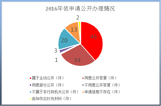 (二)辦理情況。2016年,省食品藥品監督管理局共受理公開政府信息申請120件,其中,已依法按程序辦結119件(另有1件正在征求第3方意見)。根據《中華人民共和國政府信息公開條例》相關規定,在119件答復件中,屬于主動公開的46件,同意公開答復34件,同意部分公開的1件,不同意公開答復的3件(申請公開的信息不是《條例》所指的政府信息),不屬于本行政機關公開的20件,申請信息不存在的13件,告知作出補充材料的2件。從數據上分析,由于今年推行食品藥品行政審批制度改革,下放了一大批食品藥品、醫療器械行政審批許可項目,導致非本機關政府信息申請數量占比較大。
