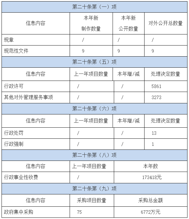 由于省市場監管局是2018年10月底新組建的部門,本報告中第二部分“主動公開政府信息情況”的數據如行政許可、行政處罰、行政強制、行政事業性收費等都是2019年度的數據,沒有上一年度的數據及增減對比。