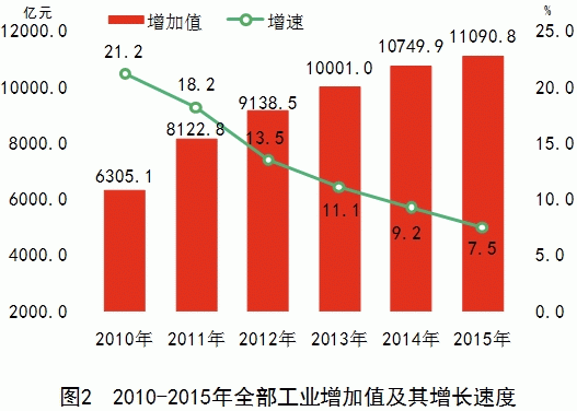 全省全部工業增加值11090.8億元,比上年增長7.5%。規模以上工業增加值增長7.8%。在規模以上工業中,新產品產值增長18.8%,占工業總產值比重為17.8%,比上年提高4.5個百分點。高加工度工業和高技術制造業增加值分別增長8.7%和13.3%;占規模以上工業增加值的比重分別為37.2%和10.5%,比上年提高0.6個和0.2個百分點。六大高耗能行業增加值增長7.0%,占規模以上工業的比重為30.3%,比上年下降0.9個百分點。非公有制企業增加值增長9.5%。園區工業增加值占規模以上工業的比重為61.5%,比上年提高2.5個百分點。分區域看,長株潭地區增長8.5%,湘南地區增長7.4%,大湘西地區增長6.8%,洞庭湖地區增長7.2%。
