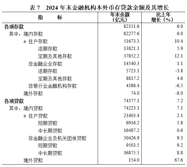 年末金融機構本外幣各項存款余額82351.6億元,比上年末增長6.0%。其中,住戶存款余額51673.3億元,增長10.4%;非金融企業存款余額14540.3億元,增長1.1%。本外幣各項貸款余額74377.1億元,增長7.2%。其中,住戶貸款余額23403.4億元,增長2.1%;非金融企業及機關團體貸款余額50426.9億元,增長9.3%。