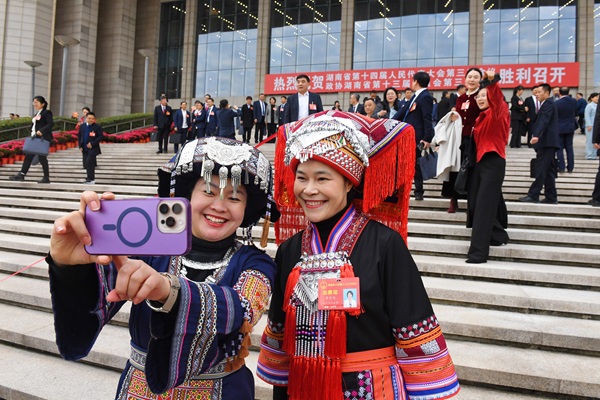 1月14日上午,湖南省第十四屆人民代表大會第三次會議開幕會后,兩位少數(shù)民族代表在會場外合影留念。湖南日報全媒體記者 徐行 攝