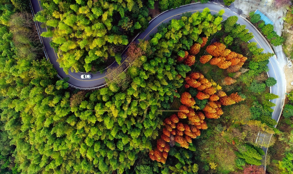 南岳西嶺鄉(xiāng)間公路上,西嶺為南岳登山起點之一,沿途山路彎彎、景色優(yōu)美,有得天獨厚的植被、水系等資源,更有黃庭觀、十里茶鄉(xiāng)、“南岳四絕”之一的“方廣寺之深”、原始次生林等景點,平均海拔在800米以上。駕車行駛在路上,當(dāng)翠綠的竹林才開始微微帶黃的時候,旁邊的水杉已經(jīng)告訴你:秋天到了。