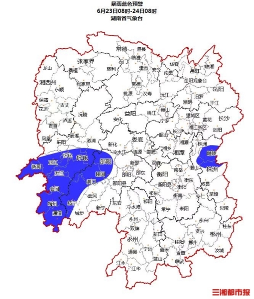 湖南省氣象臺6月23日06時發布暴雨藍色預警:預計23日08時至24日08時,株洲北部、邵陽西部、懷化南部將出現暴雨,并伴有短時強降水、雷雨大風等強對流天氣,請加強防范。此前,湖南省氣象臺于18日發布暴雨預警,至今已連續6日發布。