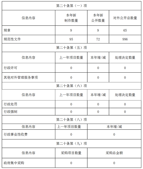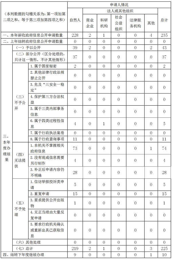 本年度報告根據(jù)《中華人民共和國政府信息公開條例》(國務院令第711號)(以下簡稱“條例”)編制,由總體情況、主動公開政府信息情況、收到和處理政府信息公開申請情況、政府信息公開行政復議和行政訴訟情況、存在的主要問題及改進情況、其他需要報告的事項六個部分組成。